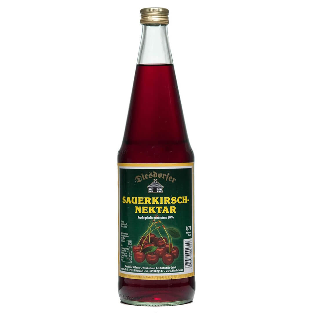 Diesdorfer Sauerkirschnektar, 0,7 L in umweltfreundlicher Mehrwegflasche.